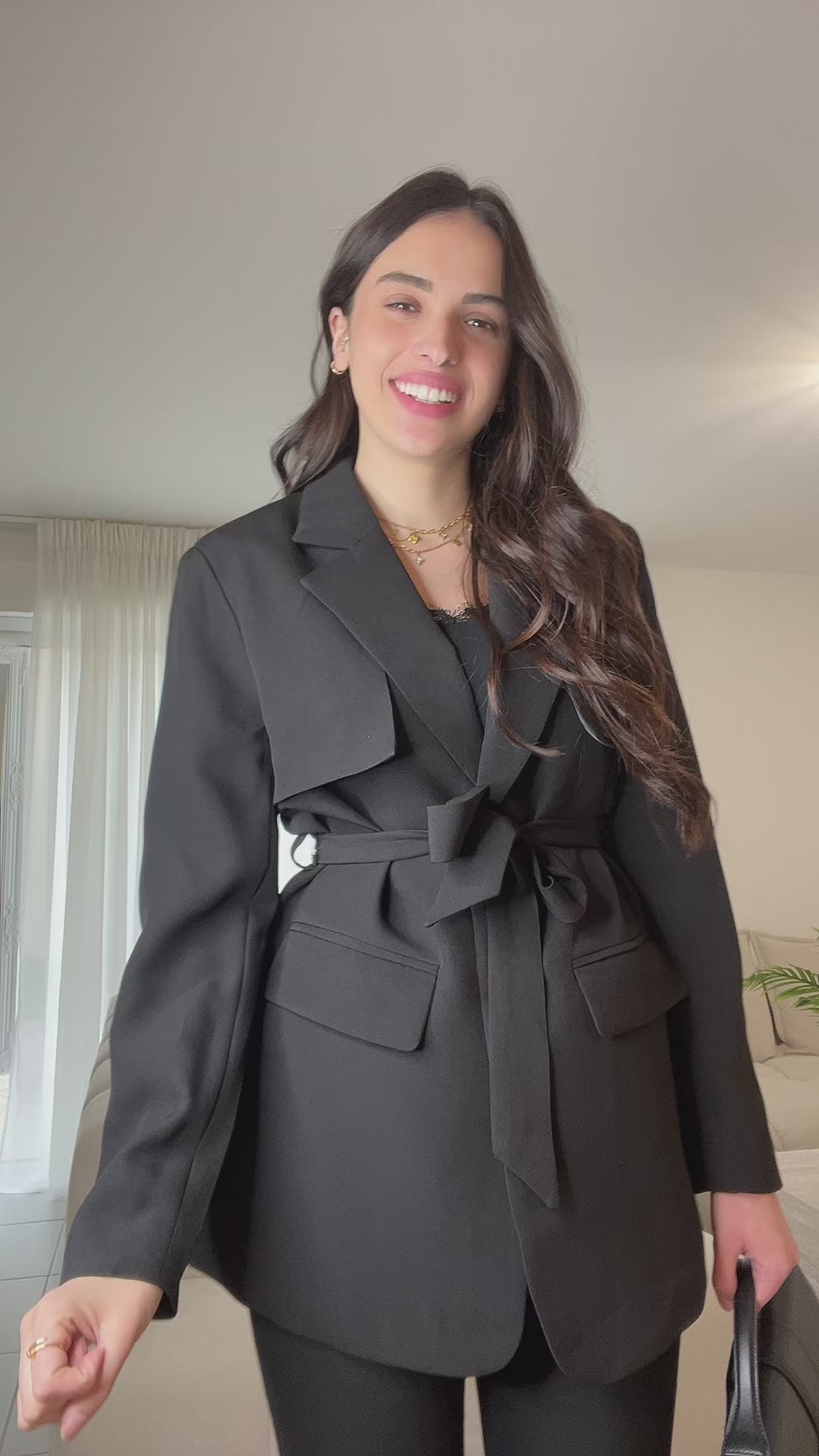 L'élégance sans compromis. Ce look tailleur noir incarne à la perfection la femme moderne et assurée. Ce blazer parfaitement ajusté ceinturé à la taille pour sublimer la silhouette.