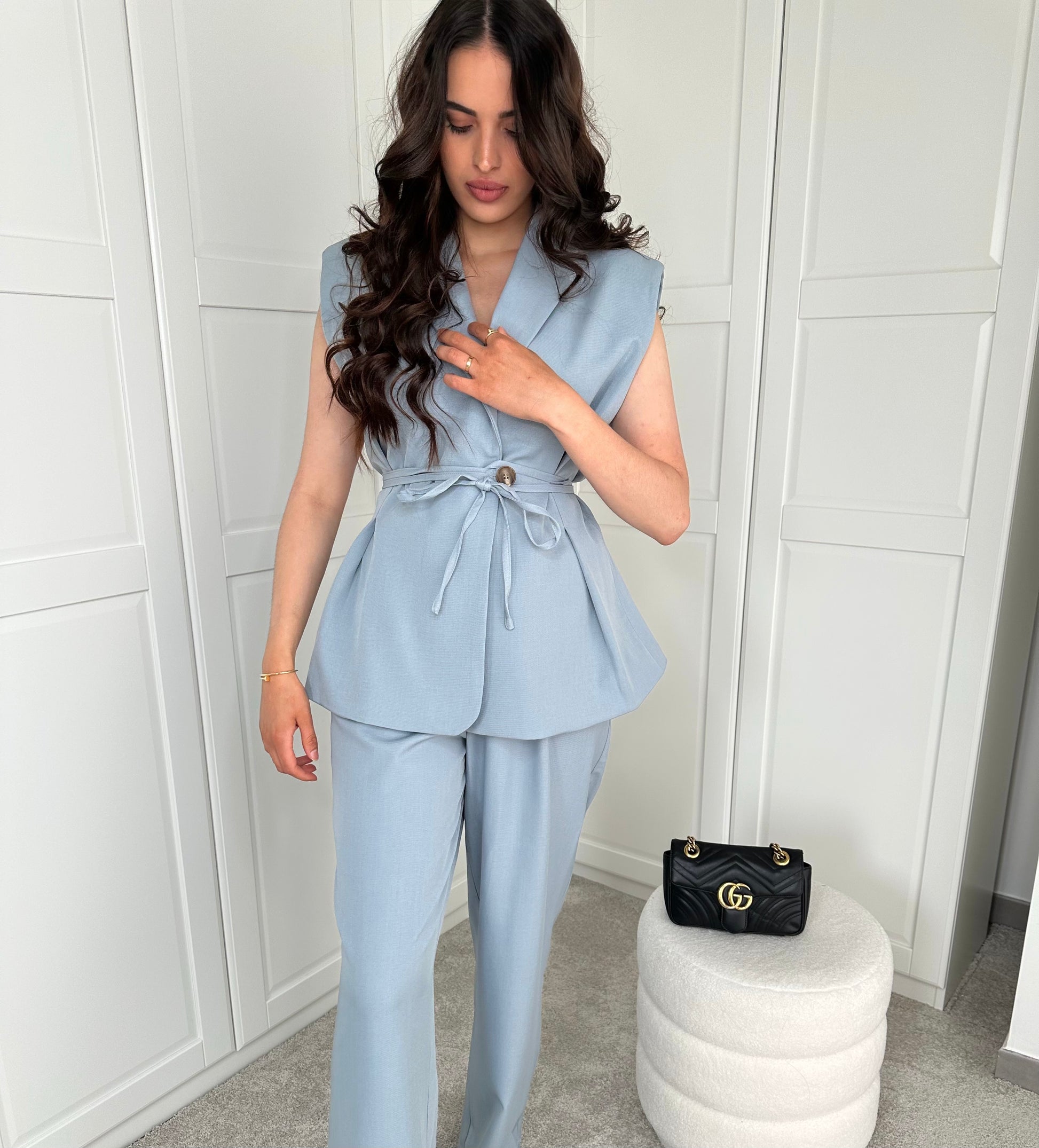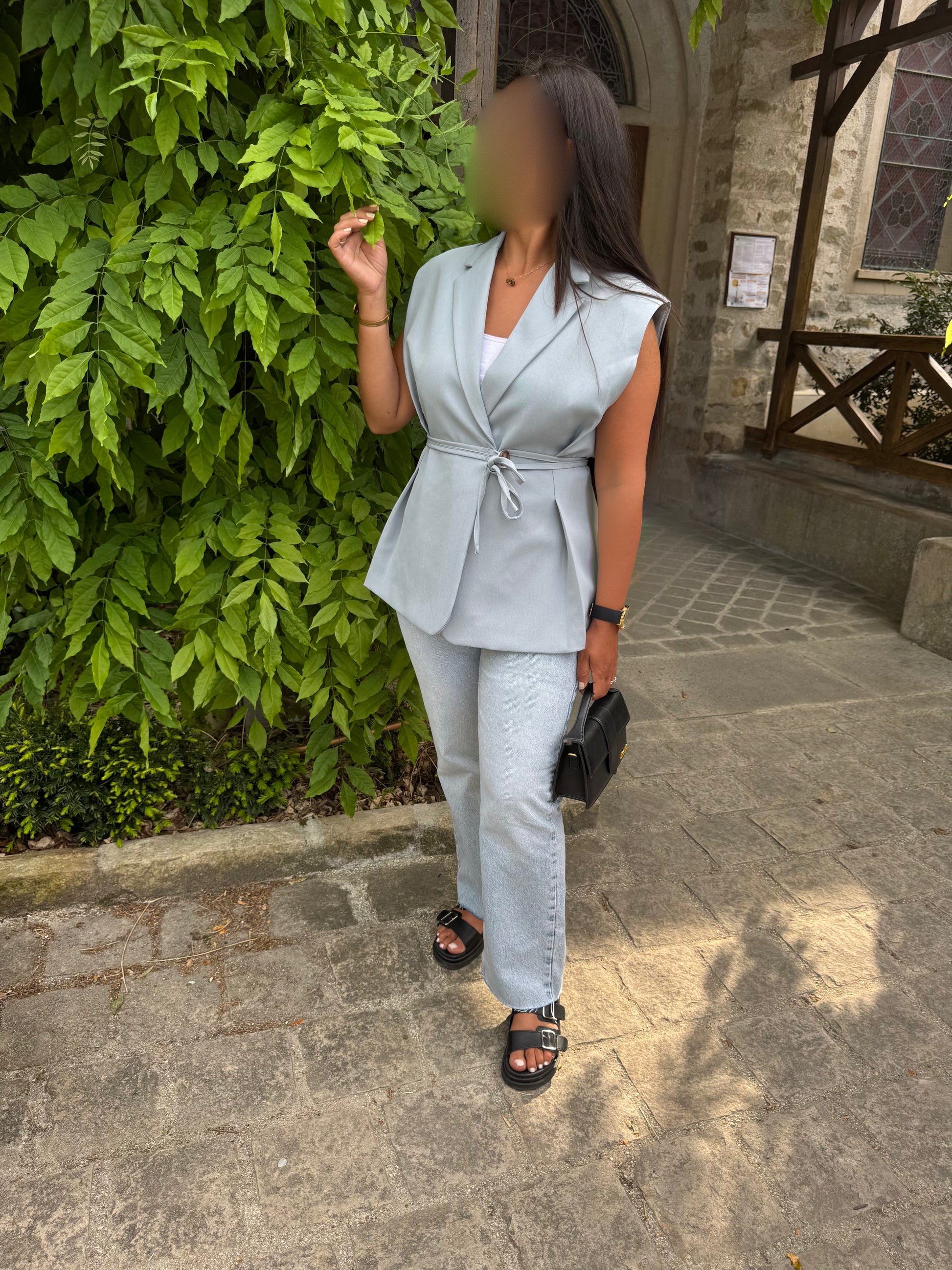 Sophistiqué, structuré et ultra féminin, le blazer sans manche s'impose comme une pièce forte de votre garde-robe. Avec sa coupe fluide, sa teinte bleu et sa ceinture ton sur ton à nouer à la taille, il sublime la silhouette tout en affirmant un style élégant et moderne.