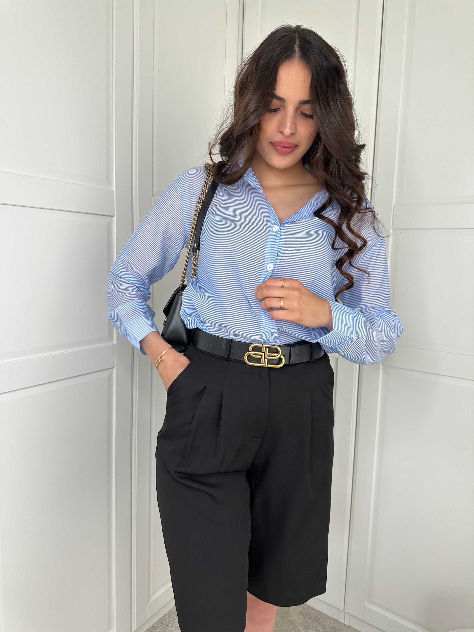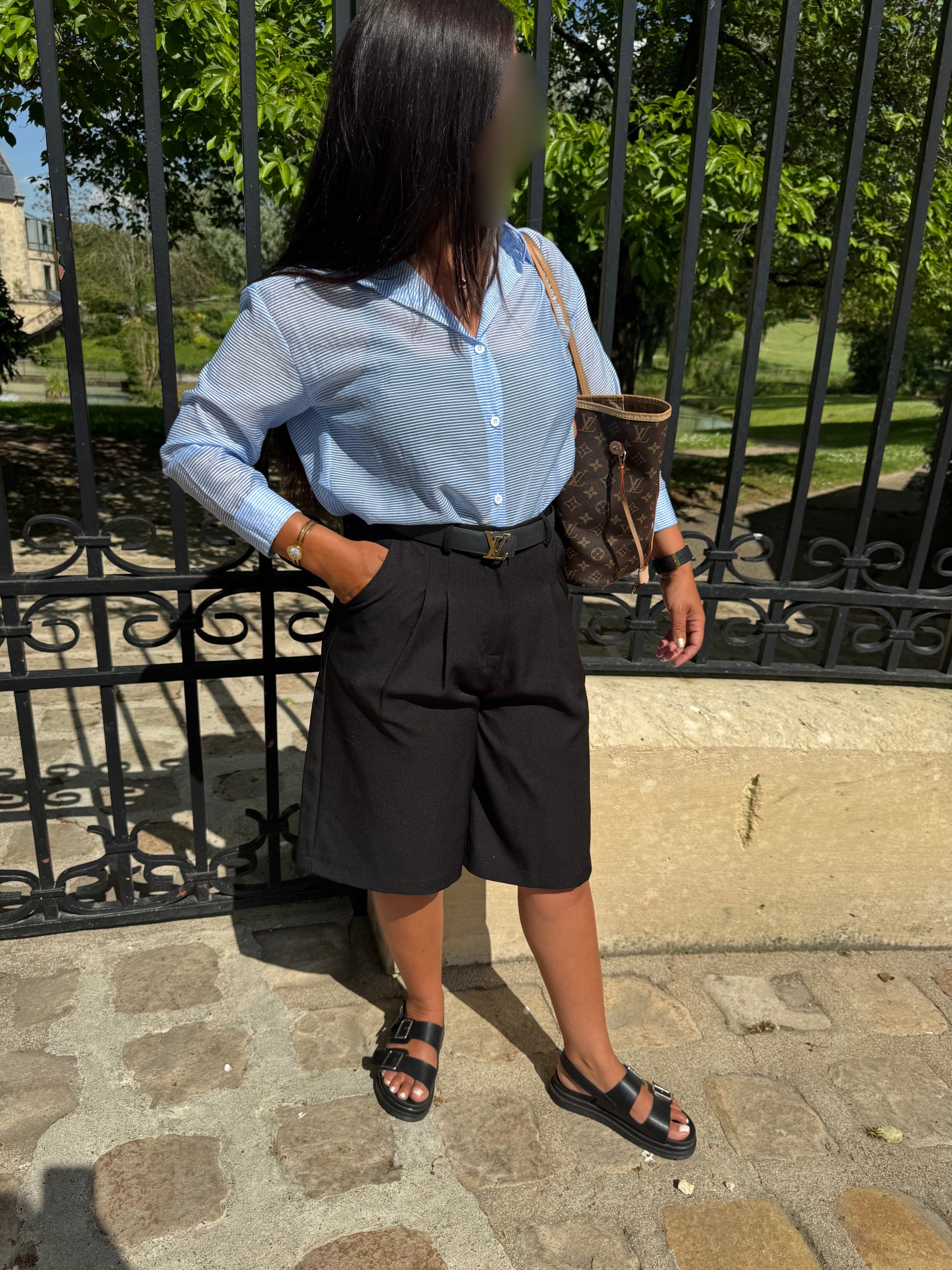 Cette tenue est élégante et moderne, elle se compose d'une chemise fluide à fines rayures bleues (chemise à retrouver dans nos nouveautés sur notre site), associée à un bermuda noir taille haute au tombé impeccable.