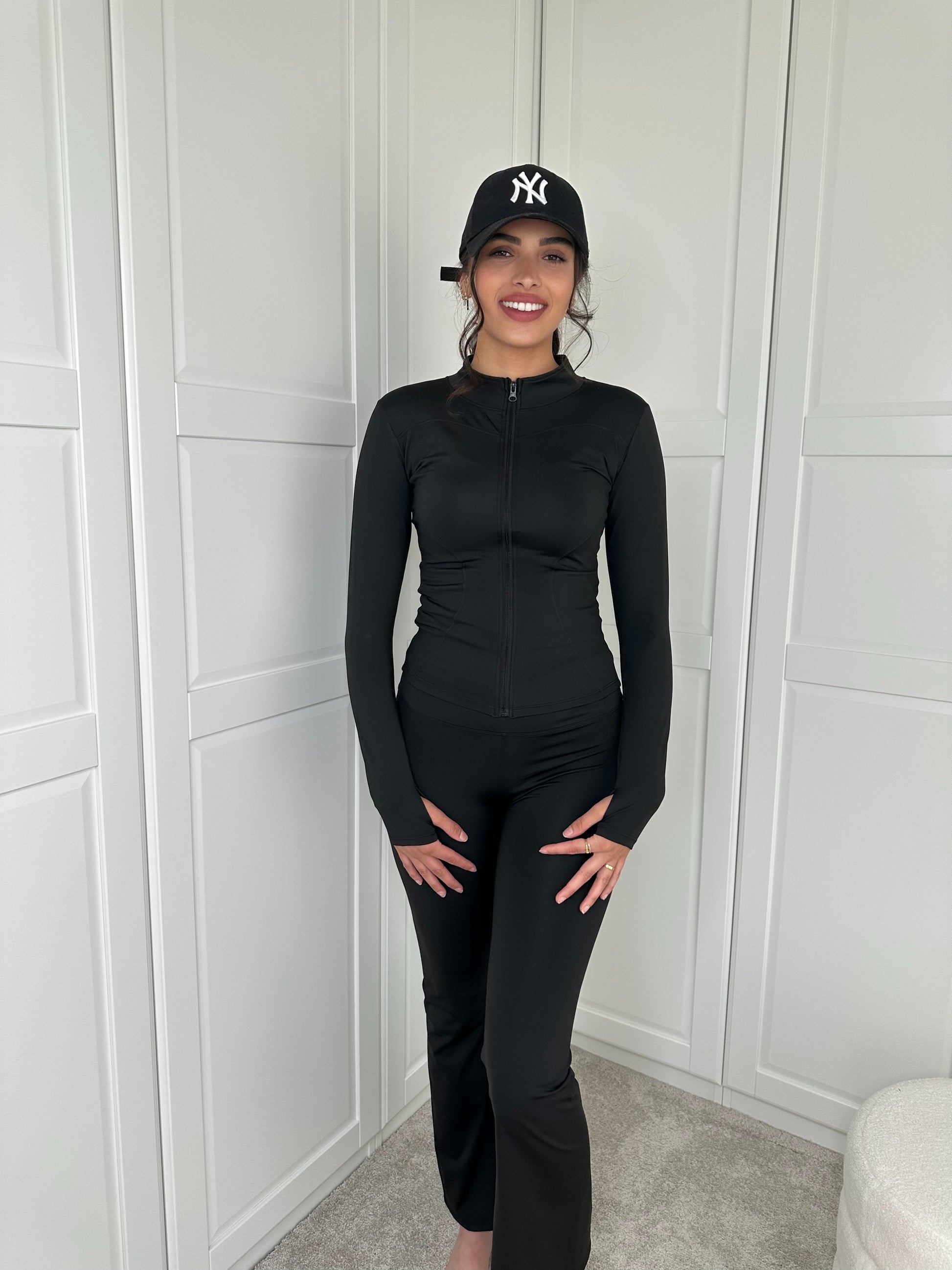 Cet ensemble sport noir ultra-tendance est composé d'un haut à manches longues zippé et d'un pantalon évasé taille haute, il allie confort, style et performance. Sa coupe près du corps met en valeur la silhouette
